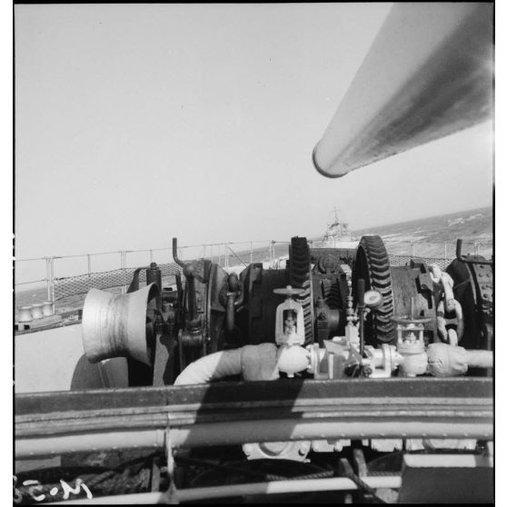 Plage avant du contre-torpilleur Le Malin suivant le contre-torpilleur Le Fougueux lors d'une mission de convoyage.