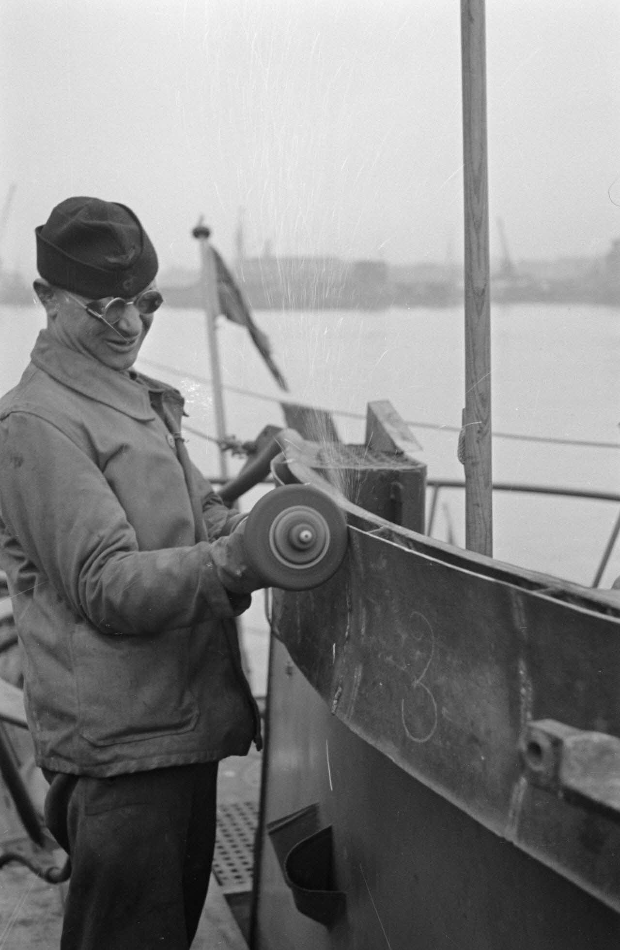 Portrait d'un marin effectuant une réparation sur un sous-marin allemand U-boot, l'ouvrier se focalise sur le kiosque du submersible.