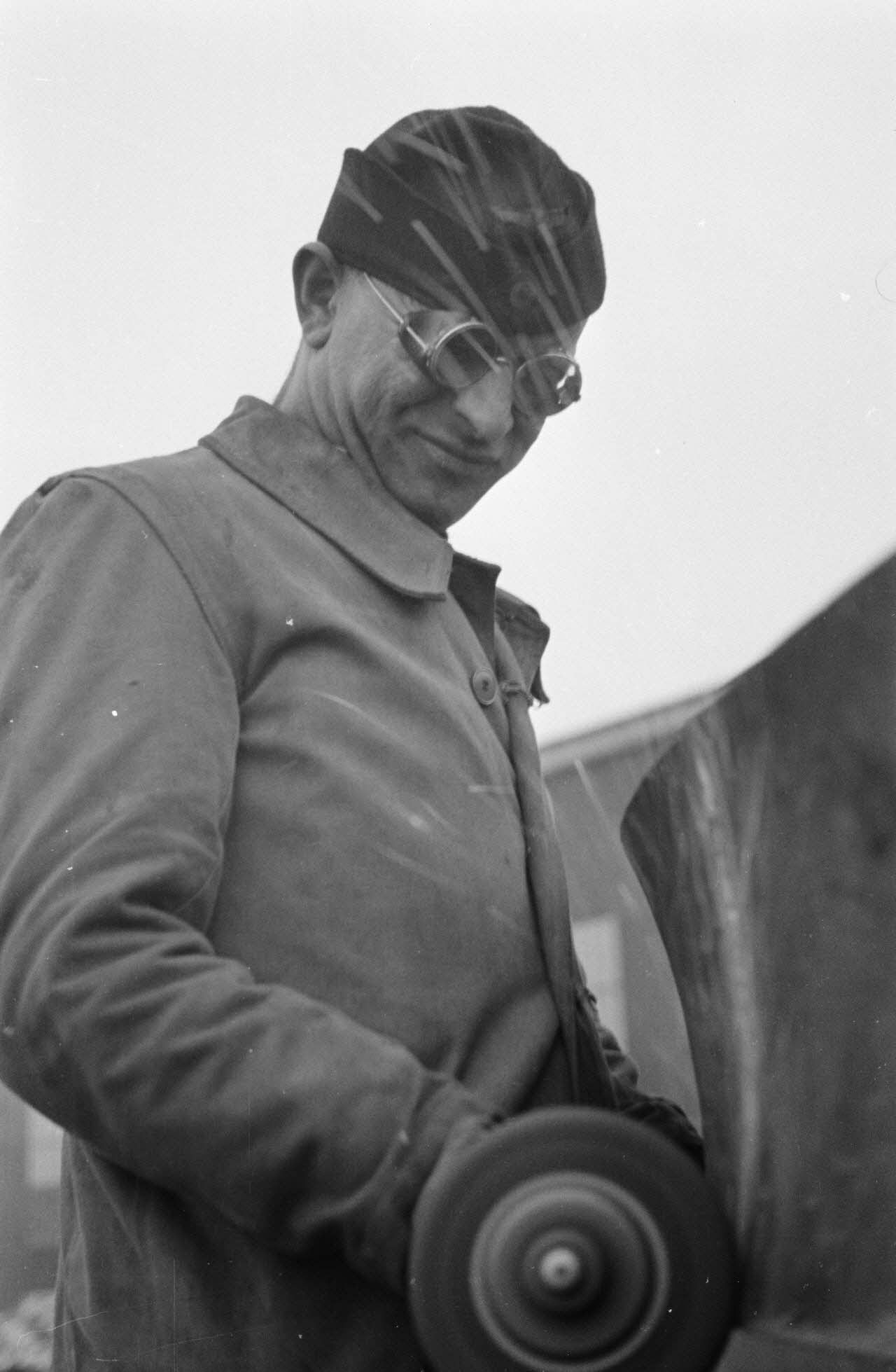 Portrait d'un marin effectuant une réparation sur un sous-marin allemand U-boot, l'ouvrier se focalise sur le kiosque du submersible.