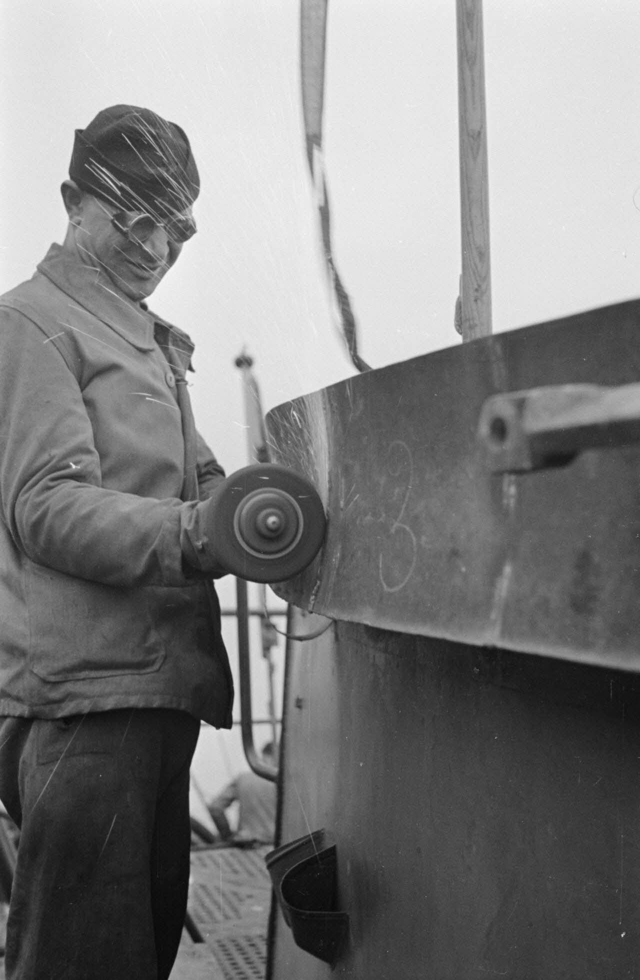 Portrait d'un marin effectuant une réparation sur un sous-marin allemand U-boot, l'ouvrier se focalise sur le kiosque du submersible.