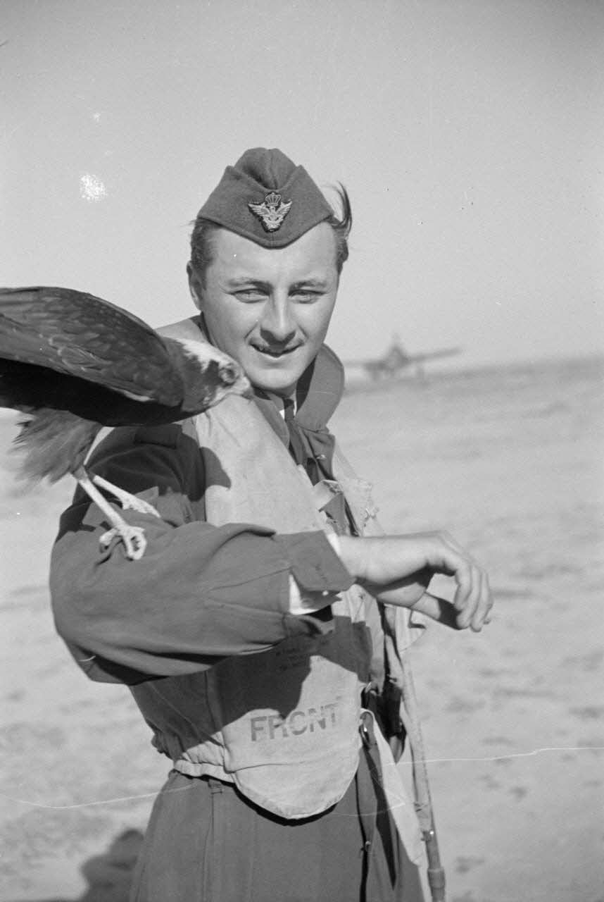 Portrait d'un pilote roumain et d'un faucon (oiseau) sur le bras.