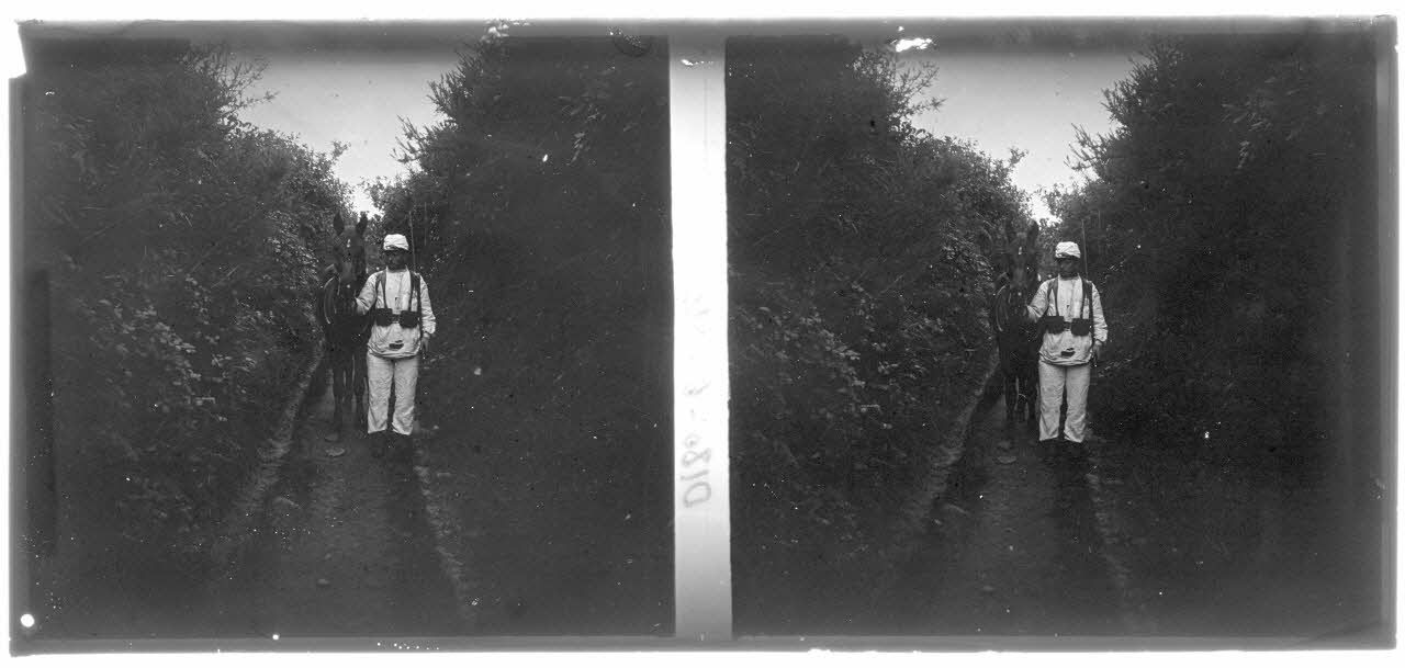 [Portrait d'un soldat avec son cheval dans un chemin].