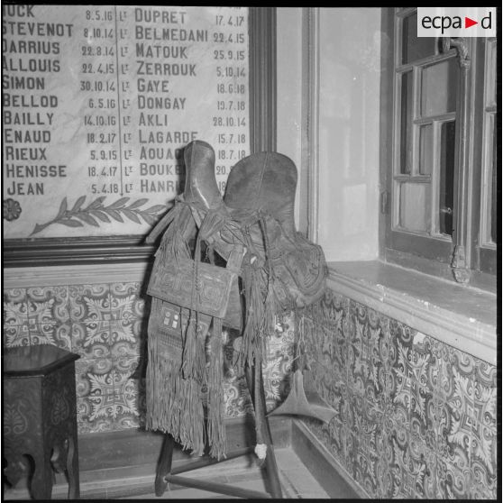 Une selle de dromadaire exposée dans la salle d'honneur du 1er régiment de tirailleurs algériens (RTA) à Blida.