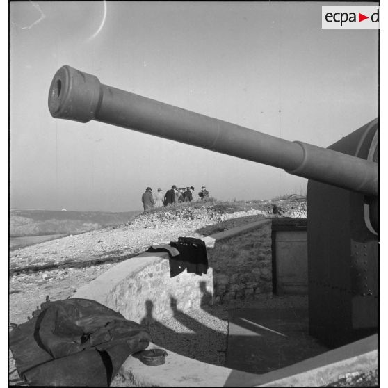 Lors de la visite de journalistes américains, des marins chargent un obus dans un canon de défense côtière dans la région de Brest.