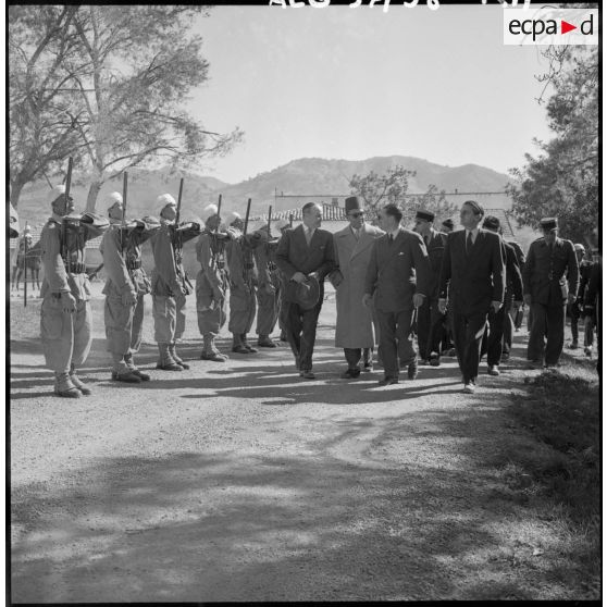 M. Bourgès-Maunoury passe en revue un piquet d'honneur lors d'un déplacement en Algérie.