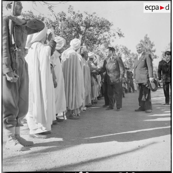 MM. Lejeune et Bourgès-Maunoury sont accueillis dans un village d'Algérie.