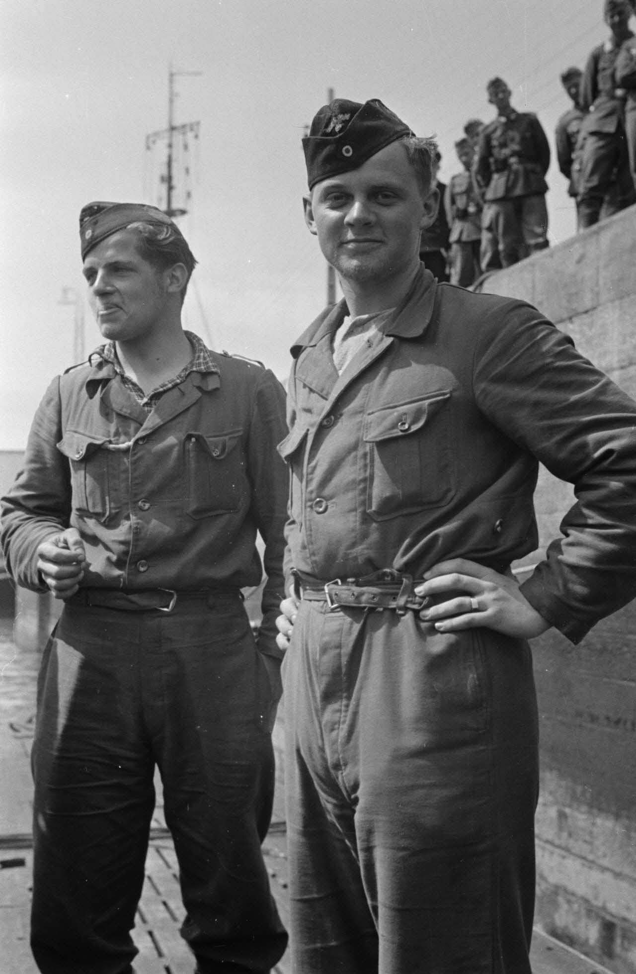 Portrait de sous-mariniers du U-203, lors de l'arrivée dans le port de Saint-Nazaire du sous-marin.