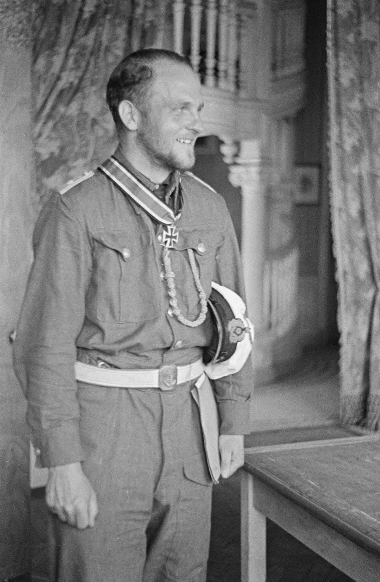 Portrait du lieutenant (Oberleutnant zur See) Erich Topp reçu au quartier général des sous-marins allemands de Lorient pour la remise de sa croix de chevalier de la croix de fer (Ritterkreuz).