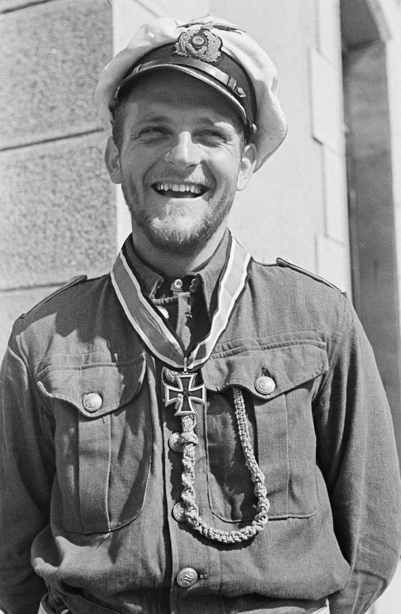 Portrait du lieutenant (Oberleutnant zur See) Erich Topp reçu au quartier général des sous-marins allemands de Lorient pour la remise de sa croix de chevalier de la croix de fer (Ritterkreuz).