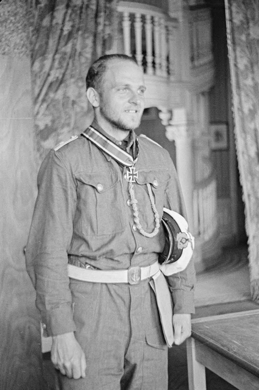 Portrait du lieutenant (Oberleutnant zur See) Erich Topp reçu au quartier général des sous-marins allemands de Lorient pour la remise de sa croix de chevalier de la croix de fer (Ritterkreuz).