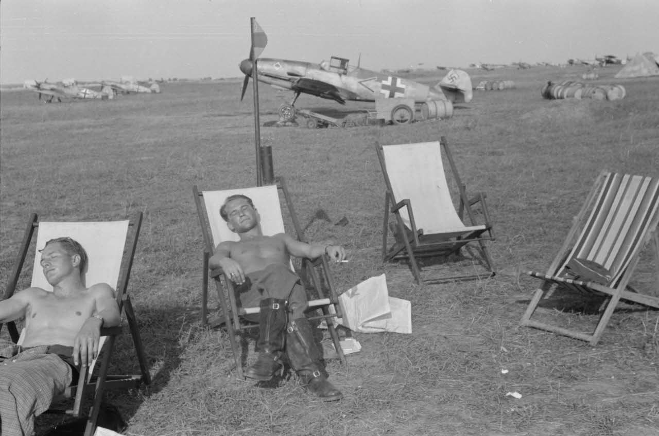 Portrait du lieutenant Franz von Werra du 1er groupe du Jagdgeschwader 53 " Pik As " (I./JG 53), assis dans une chaise longue, torse nu, fumant une cigarette.