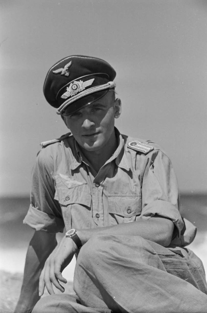 Coiffé d'une casquette blanche, le reporter Ernst Jost Graf von Hardenberg, Sonderführer et caméraman de la 7e compagnie de propagande de la Luftwaffe (Luftwaffe Kriegsberichter Kompanie). Portrait du lieutenant Höpfer.