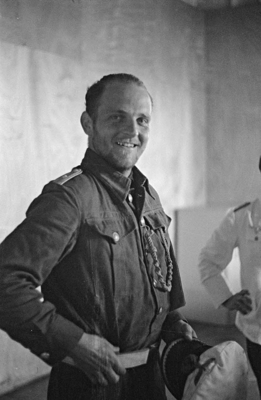 Portrait du lieutenant (Oberleutnant zur See) Erich Topp reçu au quartier général des sous-marins allemands de Lorient pour la remise de sa croix de chevalier de la croix de fer (Ritterkreuz).