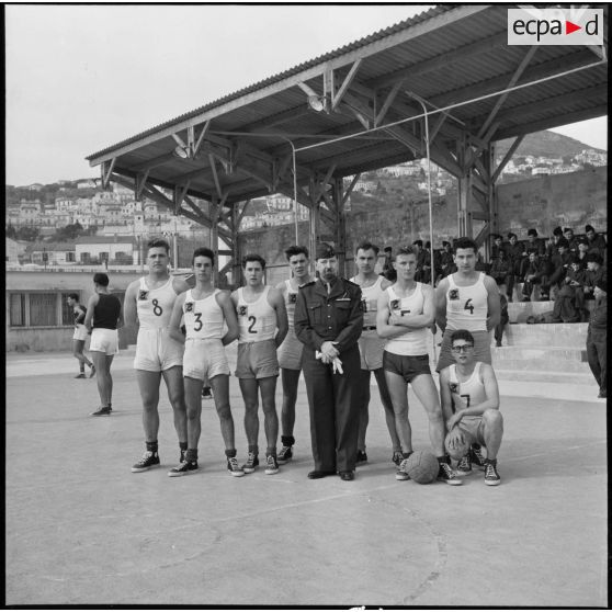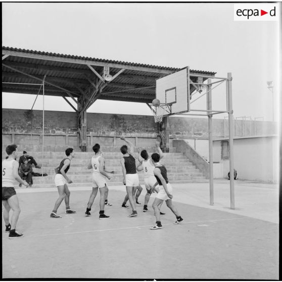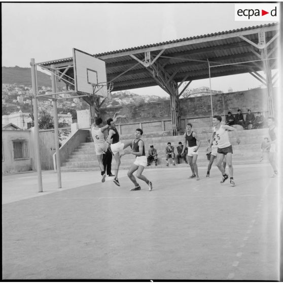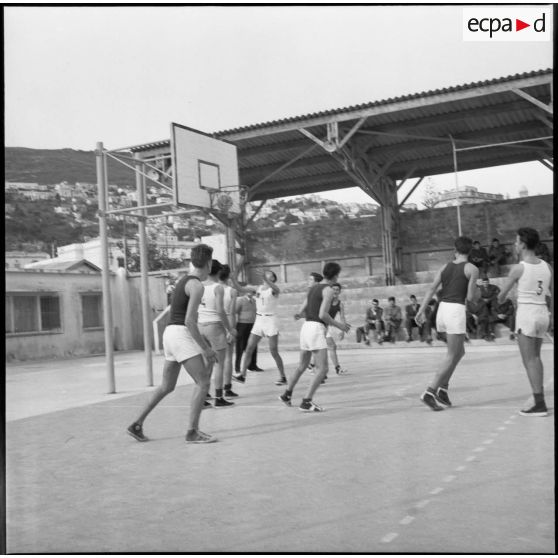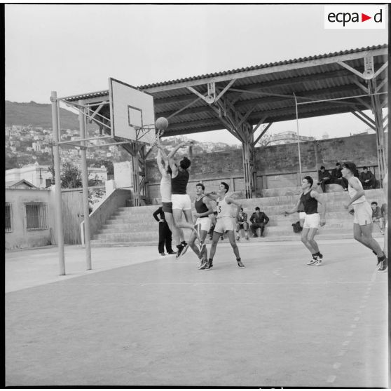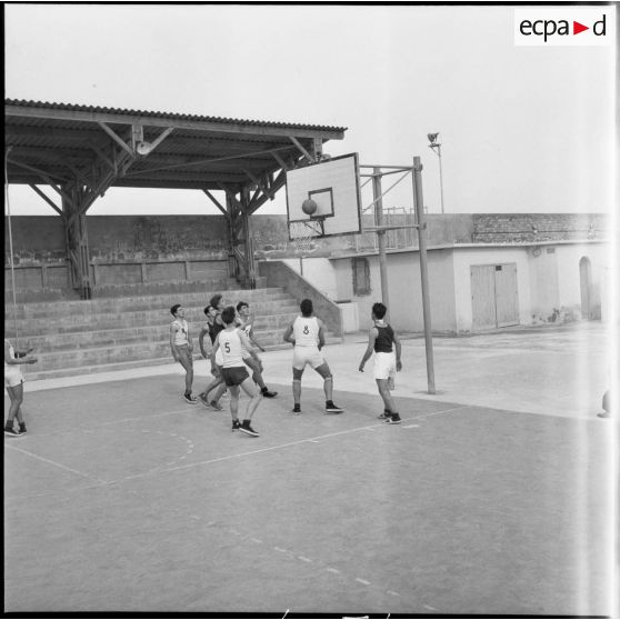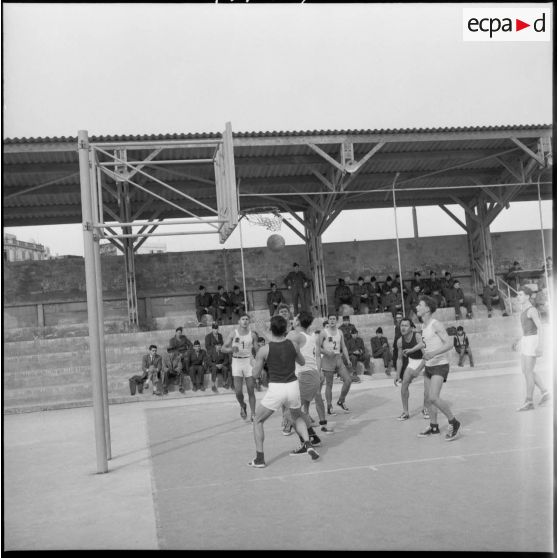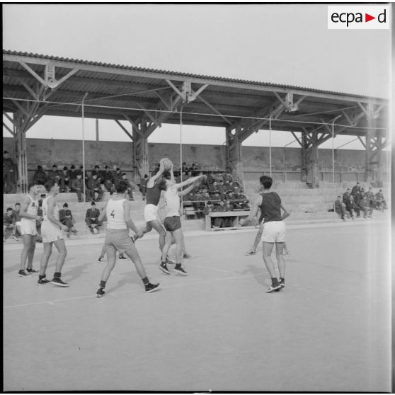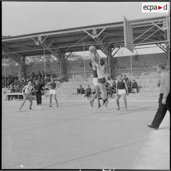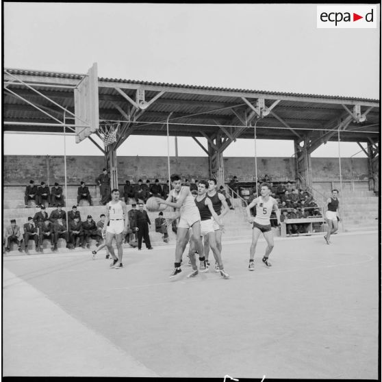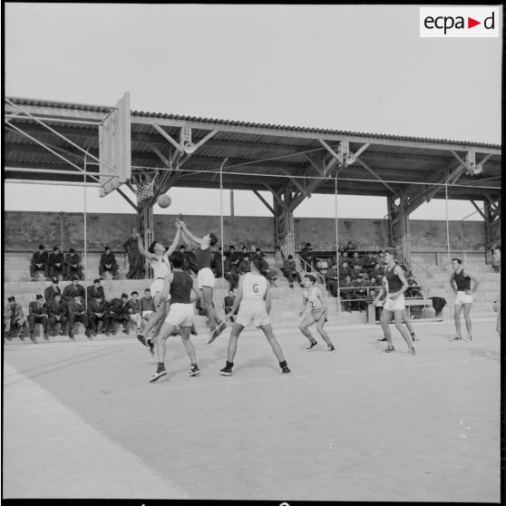 Déroulement de la partie de basket-ball lors d'un tournoi militaire dans un stade d'Alger.