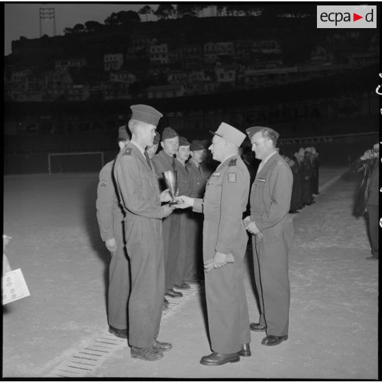 Remise de la coupe aux marins gagnants d'un tournoi de basket par un général de division dans un stade d'Alger.
