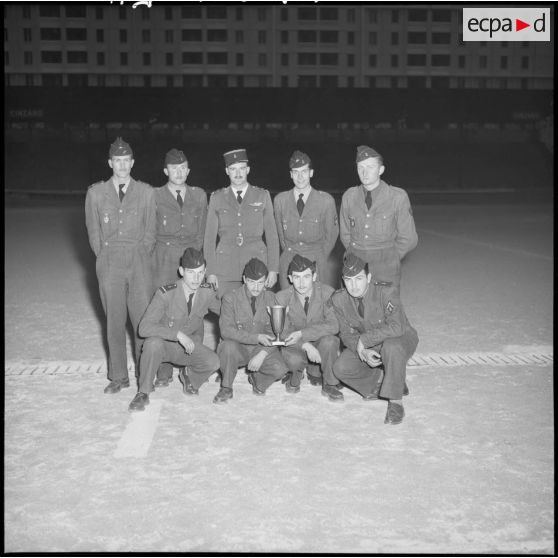 Portrait de groupe de l'équipe de marins gagnante après un tournoi de basket-ball dans un stade d'Alger.