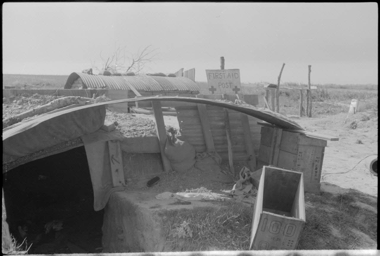 Une position antiaérienne britannique et les encuvements pour canons de 3 Inch 20 cwt AA (12 pounder 20 cwt QF) guidés par un télémètre. La batterie dispose de tranchées défensives et d'un poste de secours (First Aid post, DAA 557 L20).