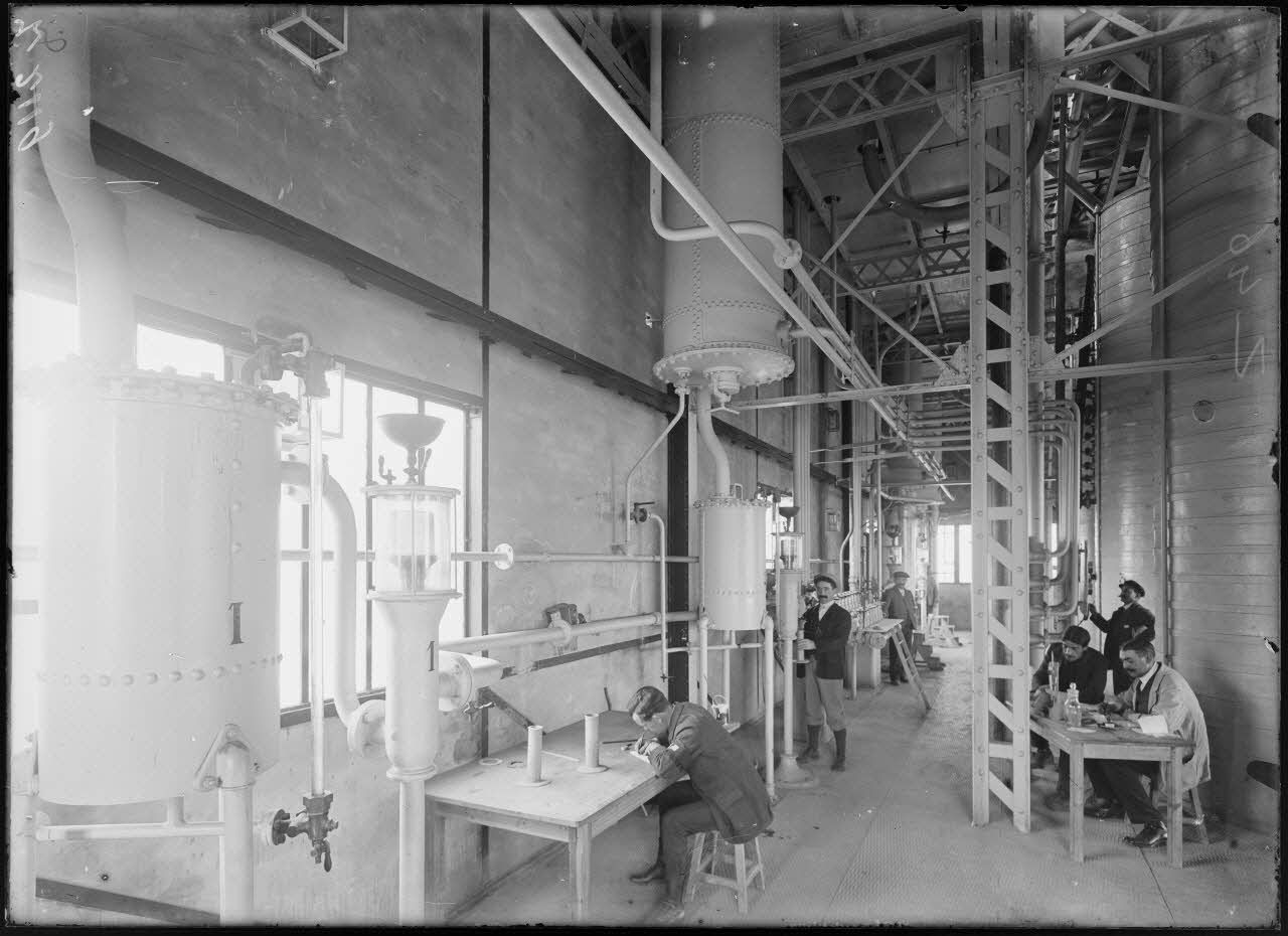 Salin-de-Giraud (Bouches-du-Rhône). Usine de produits chimiques (Compagnie d'Alais et de Camargue). Fabrication de la mélinite. Atelier d'essoreuses.