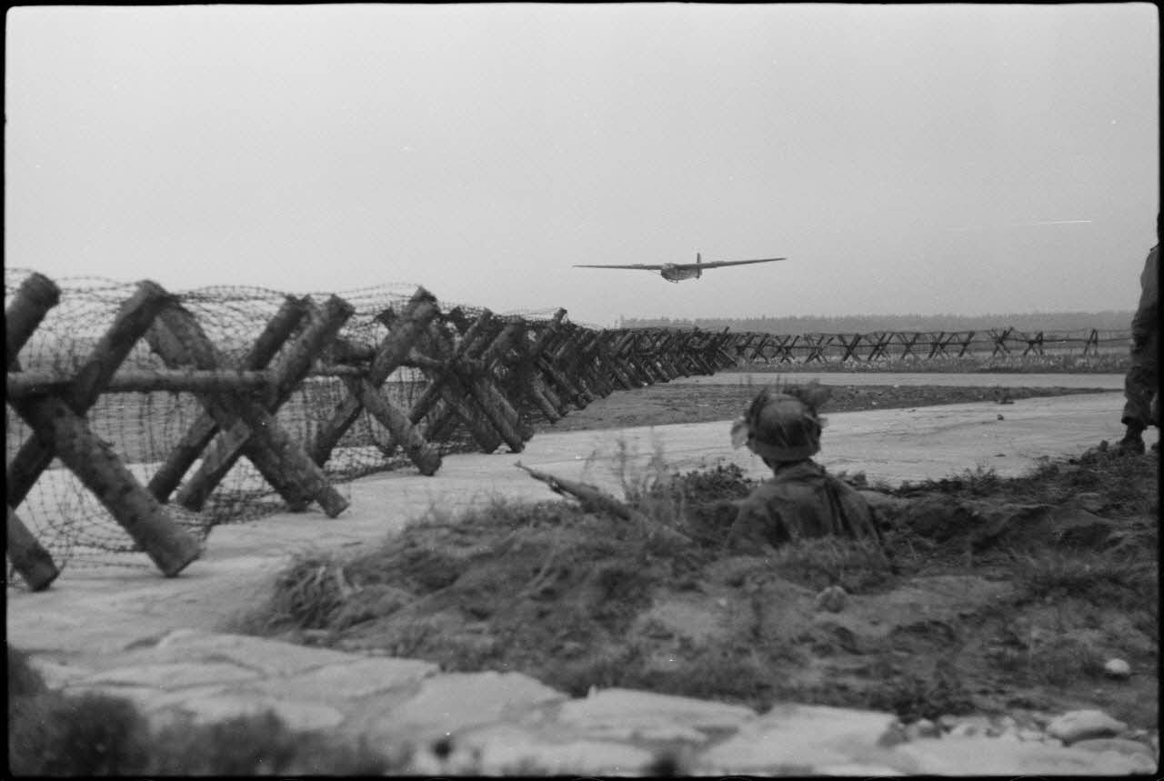 Pour les besoins de l'exercice, des fantassins de la Luftwaffe se postent autour de la piste dans des trous individuels. Une équipe de parachutistes s'équipe (casque, fumigènes, mitrailleuse MG-15 avec chargeurs).