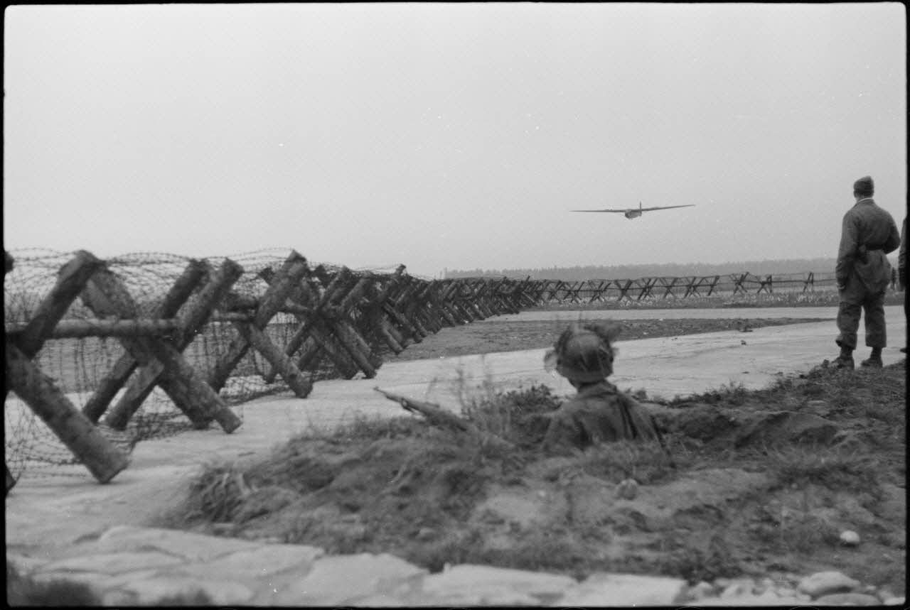 Pour les besoins de l'exercice, des fantassins de la Luftwaffe se postent autour de la piste dans des trous individuels. Une équipe de parachutistes s'équipe (casque, fumigènes, mitrailleuse MG-15 avec chargeurs).