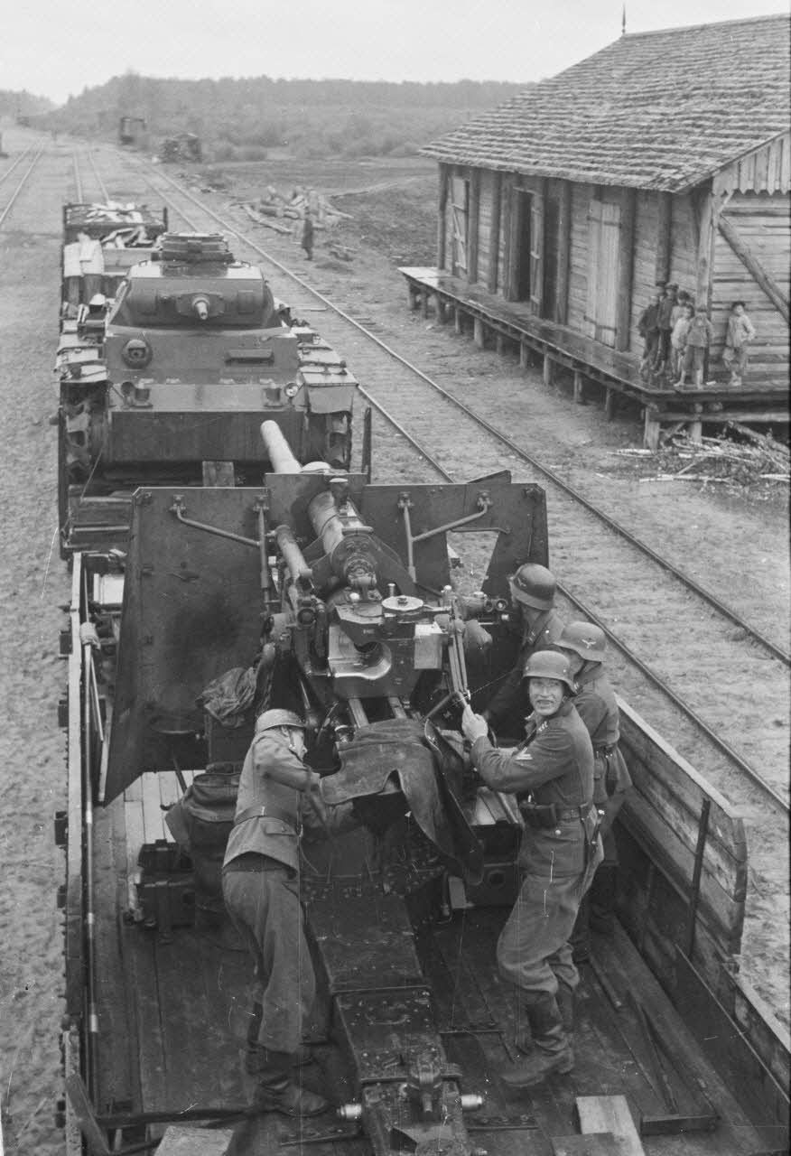 Pour lutter contre la résistance locale, un blindé Panzer-III et un canon de DCA de 8,8 cm FlaK ont été installés sur des wagons.