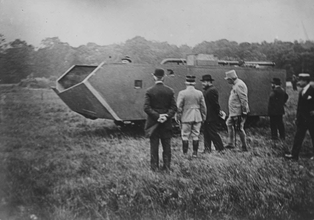 Première expérience du char d'assaut St Chamond à commande électrique (Vincennes juillet 1916).