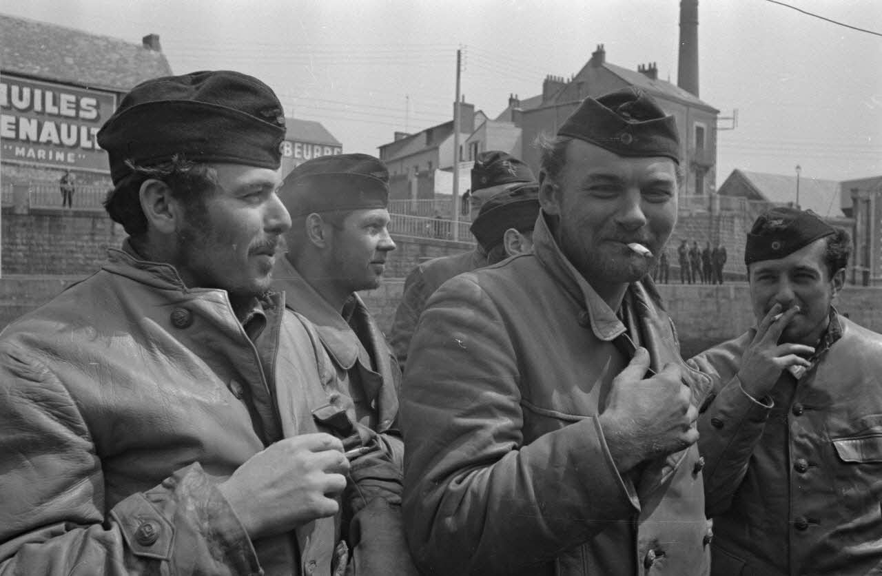 Premiers moments de détente pour des membres d'équipage du sous-marin U-Boot U-552 peu après leur retour de croisière au port de Saint-Nazaire.