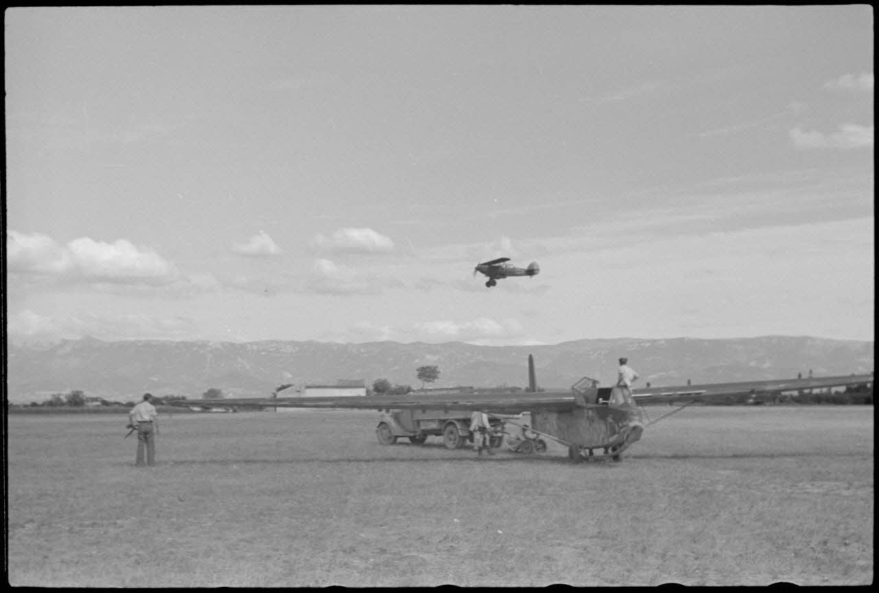 Tracté par un Avia B.534, un planeur DFS-230, dans lequel Stocker vient de monter, prend rapidement de l'altitude. Placé derrière le pilote et un mécanicien, le reporter photographie les planeurs et les remorqueurs ainsi que le paysage.