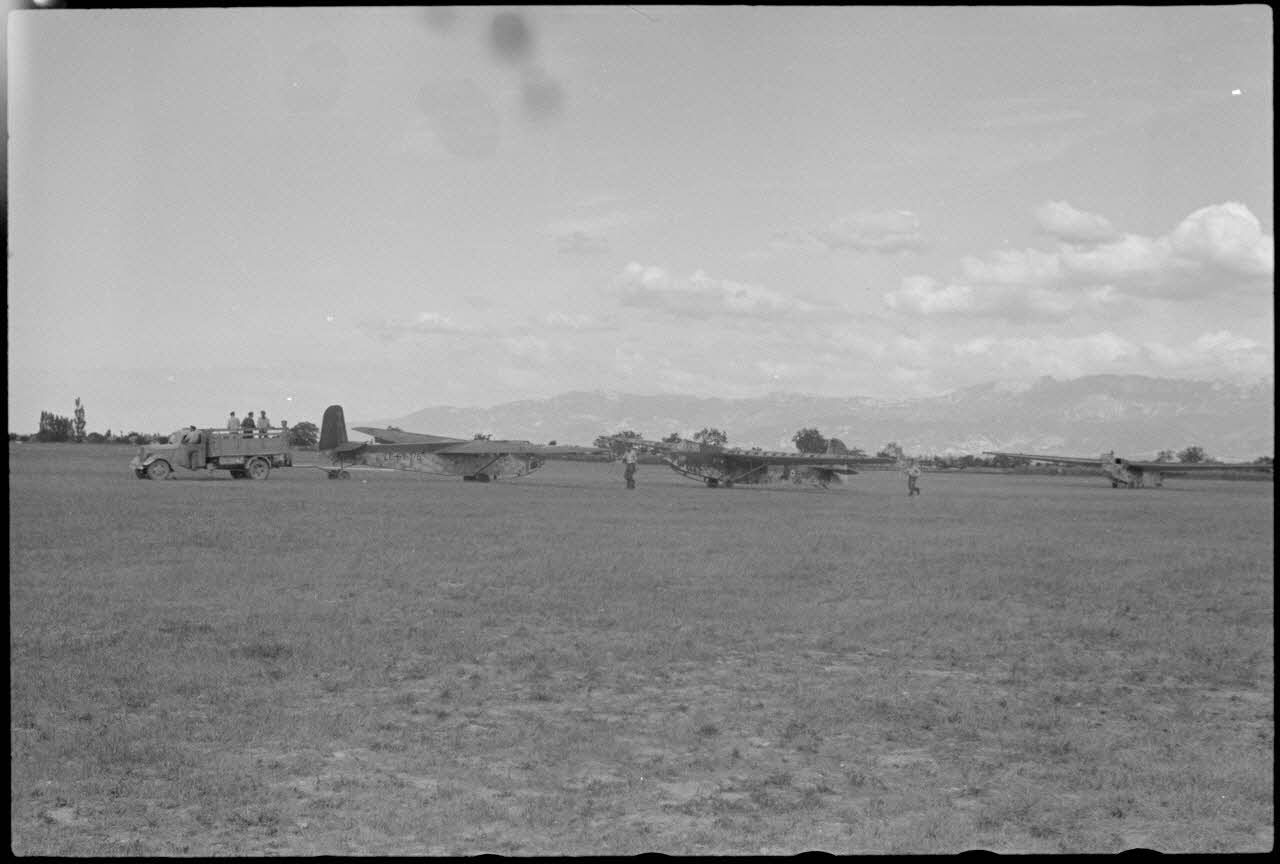 Sur le terrain d'aviation de Lézignan-Corbières, des camions Opel Blitz acheminent les planeurs vers leur tracteur (biplans Avia B.534). Les pilotes revêtissent des gilets de sauvetage pour la traversée vers l'Italie et l'aérodrome de Pratica di Mare (au sud de Rome).