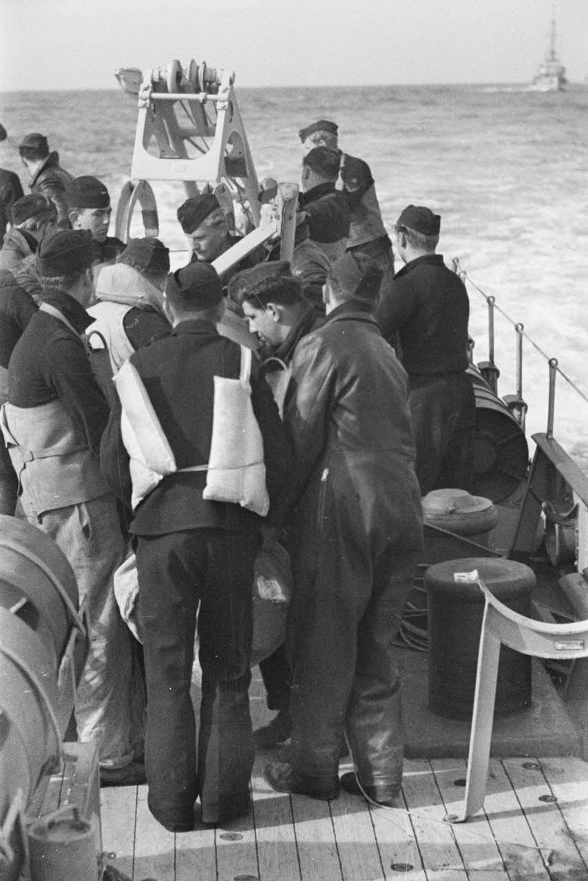 Note : A défaut de légende d'origine, l'ECPAD conserve pour le reporter Kramer un titre d'origine et le numéro de la compagnie dans laquelle évolue le reporter : la 5e demi-compagnie de reporters de guerre de la marine allemande (5 Marine Kriegsberichter-Halbkompanie). Ces informations tapées à la machine et agrafées au début de la pellicule photographique ne mentionnent pas la date ni le lieu du reportage. Le journal de marche de l'unité de propagande (Marine Propaganda-Abteilung West) est disponible aux archives du NARA de Washington (référence : NARA National Microcopy T-77 Roll 1021 Kriegsmarine 269). Pour la période concernée, on trouve la date exacte ainsi que le titre du reportage : 12-24.10 BB Kramer : Bordeinsatz auf einem Minensuchboot.