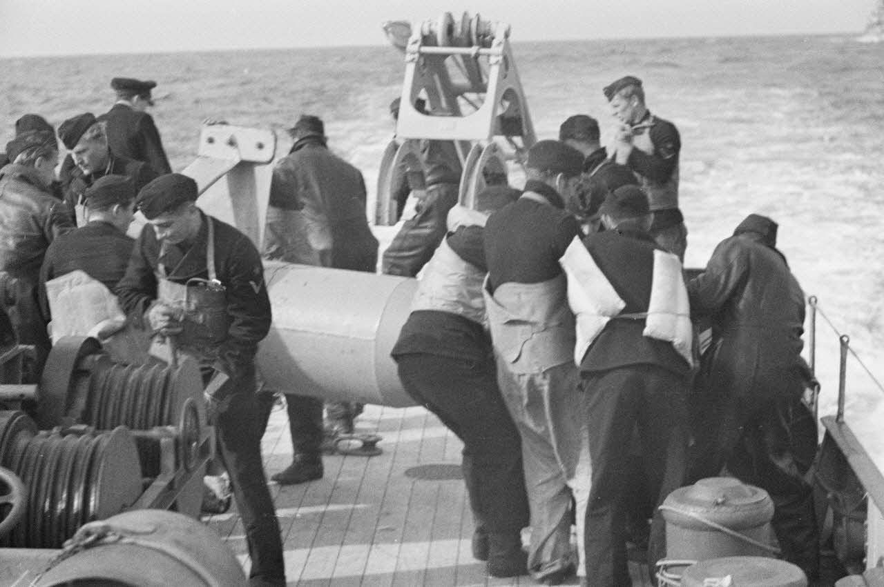 Note : A défaut de légende d'origine, l'ECPAD conserve pour le reporter Kramer un titre d'origine et le numéro de la compagnie dans laquelle évolue le reporter : la 5e demi-compagnie de reporters de guerre de la marine allemande (5 Marine Kriegsberichter-Halbkompanie). Ces informations tapées à la machine et agrafées au début de la pellicule photographique ne mentionnent pas la date ni le lieu du reportage. Le journal de marche de l'unité de propagande (Marine Propaganda-Abteilung West) est disponible aux archives du NARA de Washington (référence : NARA National Microcopy T-77 Roll 1021 Kriegsmarine 269). Pour la période concernée, on trouve la date exacte ainsi que le titre du reportage : 12-24.10 BB Kramer : Bordeinsatz auf einem Minensuchboot.