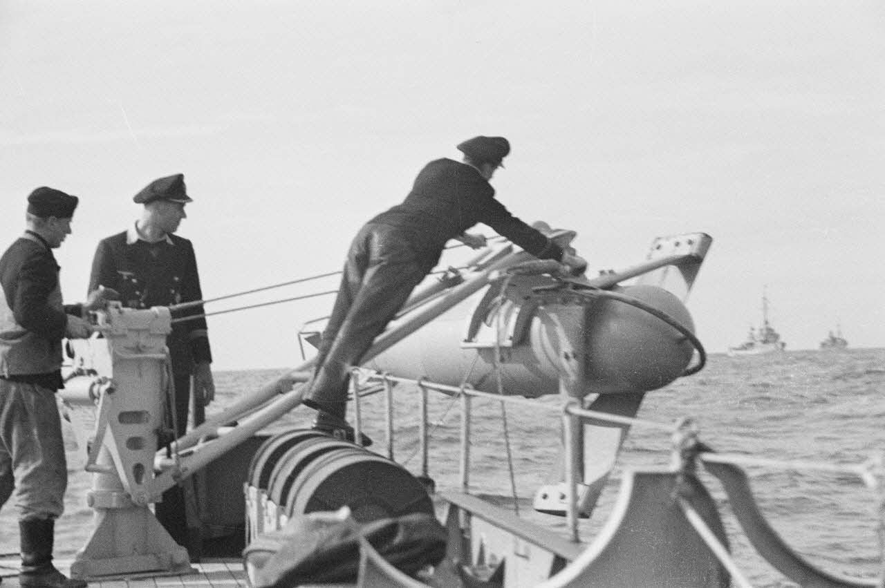En vue de la destruction de mines, une patrouille de dragueurs de mines (Minensuchboot) de la Kriegsmarine.
