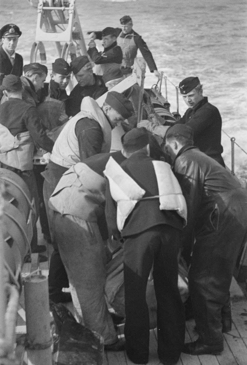 Note : A défaut de légende d'origine, l'ECPAD conserve pour le reporter Kramer un titre d'origine et le numéro de la compagnie dans laquelle évolue le reporter : la 5e demi-compagnie de reporters de guerre de la marine allemande (5 Marine Kriegsberichter-Halbkompanie). Ces informations tapées à la machine et agrafées au début de la pellicule photographique ne mentionnent pas la date ni le lieu du reportage. Le journal de marche de l'unité de propagande (Marine Propaganda-Abteilung West) est disponible aux archives du NARA de Washington (référence : NARA National Microcopy T-77 Roll 1021 Kriegsmarine 269). Pour la période concernée, on trouve la date exacte ainsi que le titre du reportage : 12-24.10 BB Kramer : Bordeinsatz auf einem Minensuchboot.