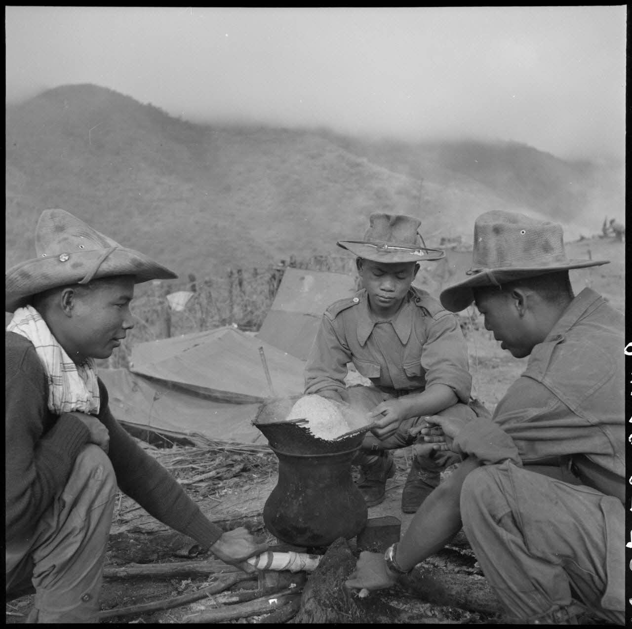 Préparation du repas par des éléments de la 2e compagnie du 5e bataillon de chasseurs laotiens (BCL) sur un point d'appui à Muong Khoua.