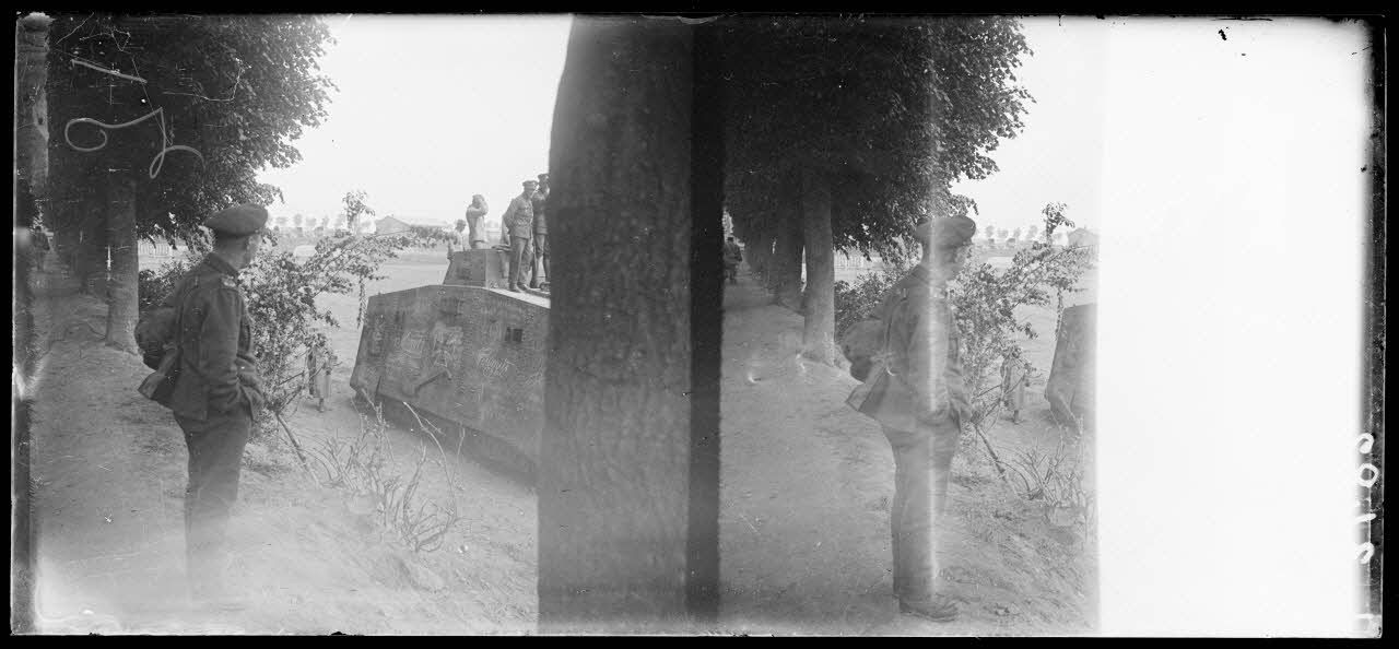 - près d'Amiens, différentes vues de l'A7V n°3 baptisé Elfriede, capturé par le 3e régiment de tirailleurs (RT) lors de la bataille à Villers-Bretonneux, des soldats britanniques ;