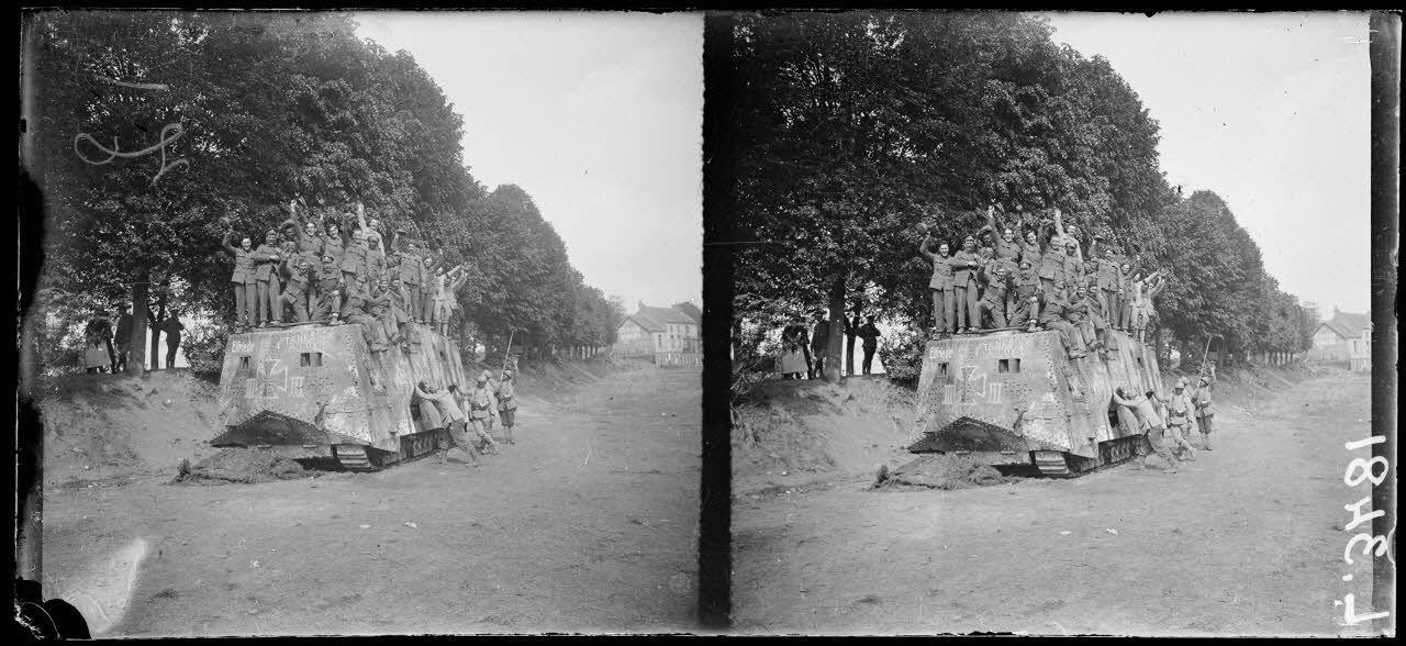 - près d'Amiens, différentes vues de l'A7V n°3 baptisé Elfriede, capturé par le 3e régiment de tirailleurs (RT) lors de la bataille à Villers-Bretonneux, des soldats britanniques ;
