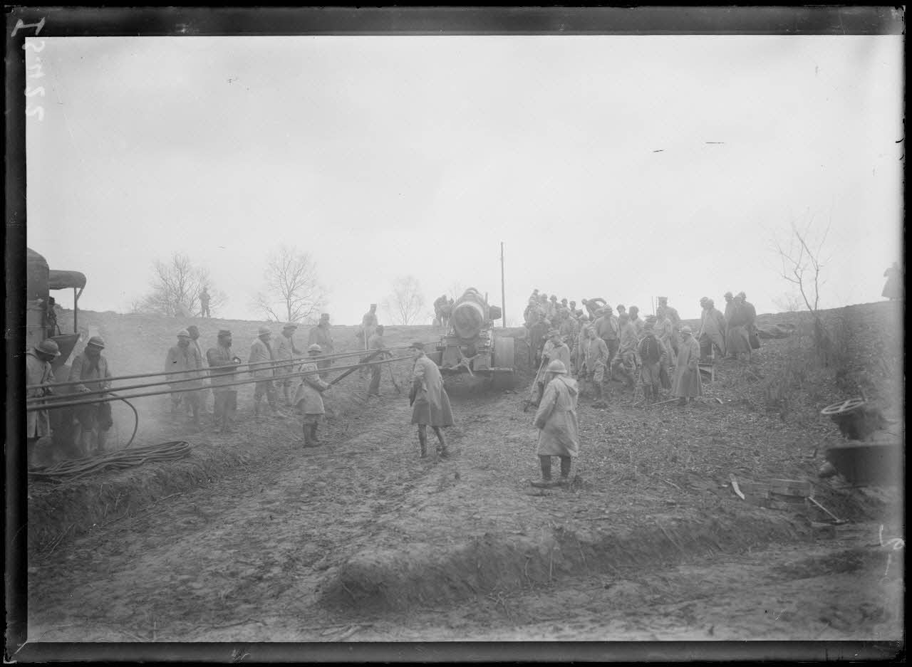 Près de Beaurieux, Aisne, mise en batterie du 1er 240 avec le nouveau dispositif permettant son transport et sa mise en batterie en route. La pièce est près d'arriver en bas du ravin.