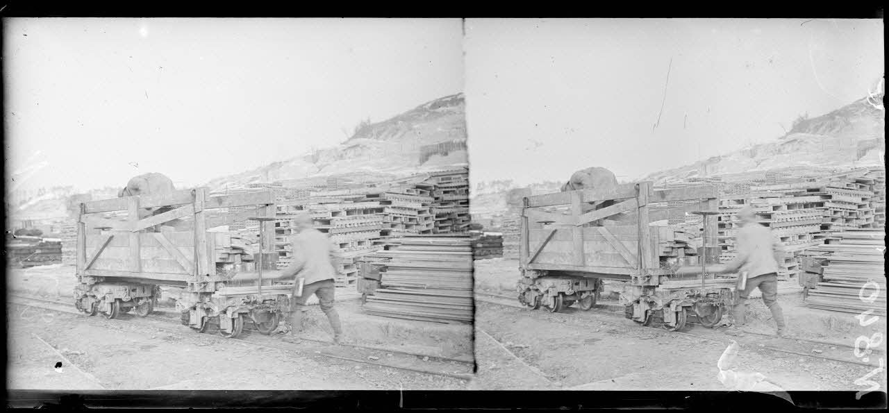 - Près de Beauséjour, panorama de la position du ravin de Marson. Des troncs d'arbre sont enlevés par les wagons de Decauville.