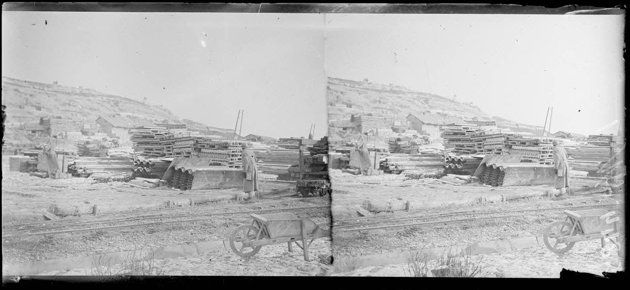 - Près de Beauséjour, panorama de la position du ravin de Marson. Des troncs d'arbre sont enlevés par les wagons de Decauville.