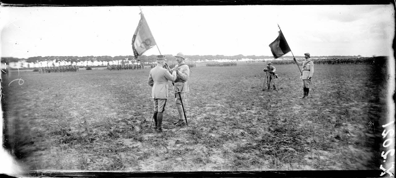 Près de Bergues (Nord), le général Pétain remet la Croix de guerre au drapeau du 33e et 235e.