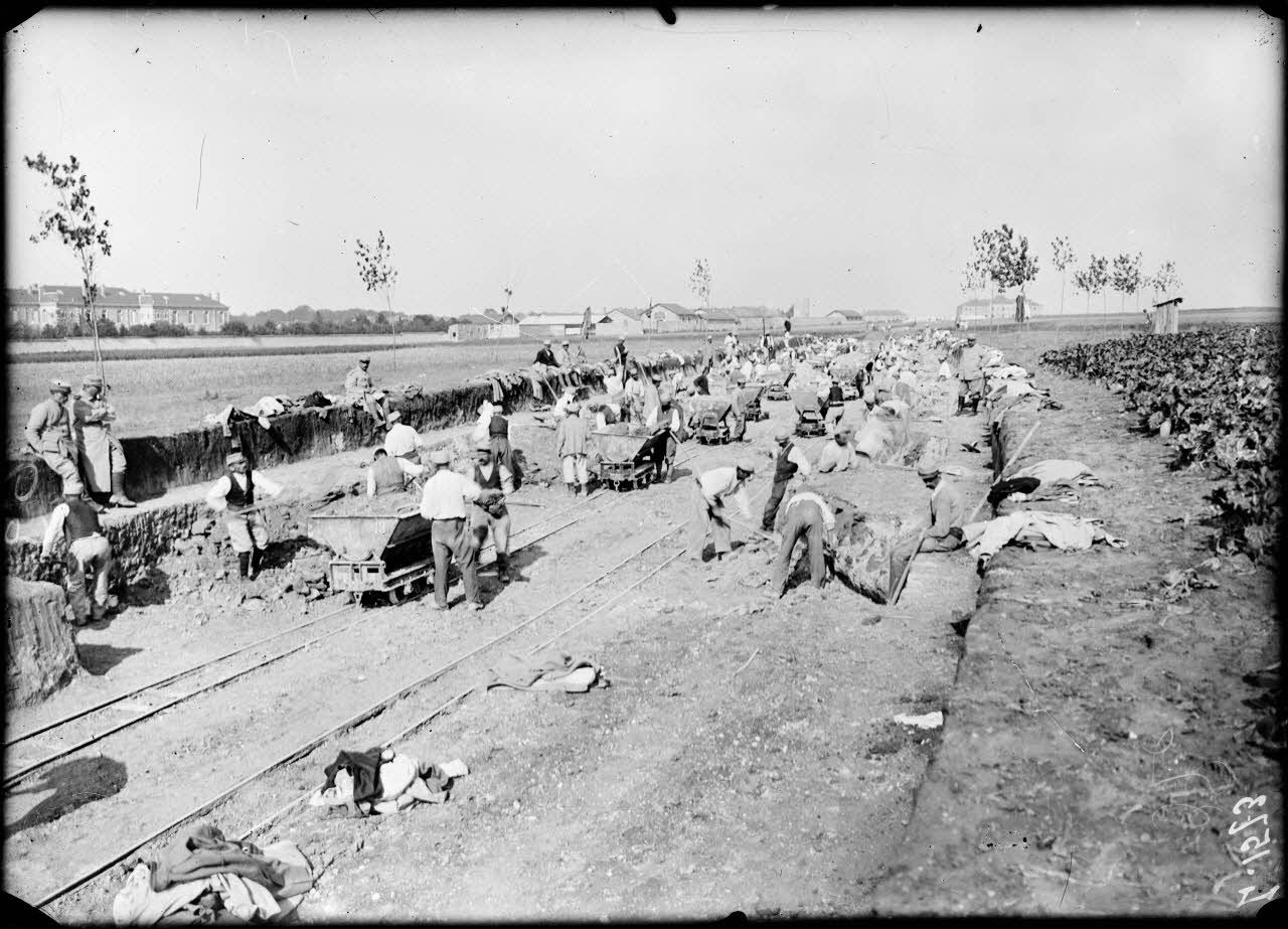 Près de Châlons-sur-Marne. Construction d'une voie ferrée du camp de Mailly à Saint-Hilaire-le-Grand. Le remblai.