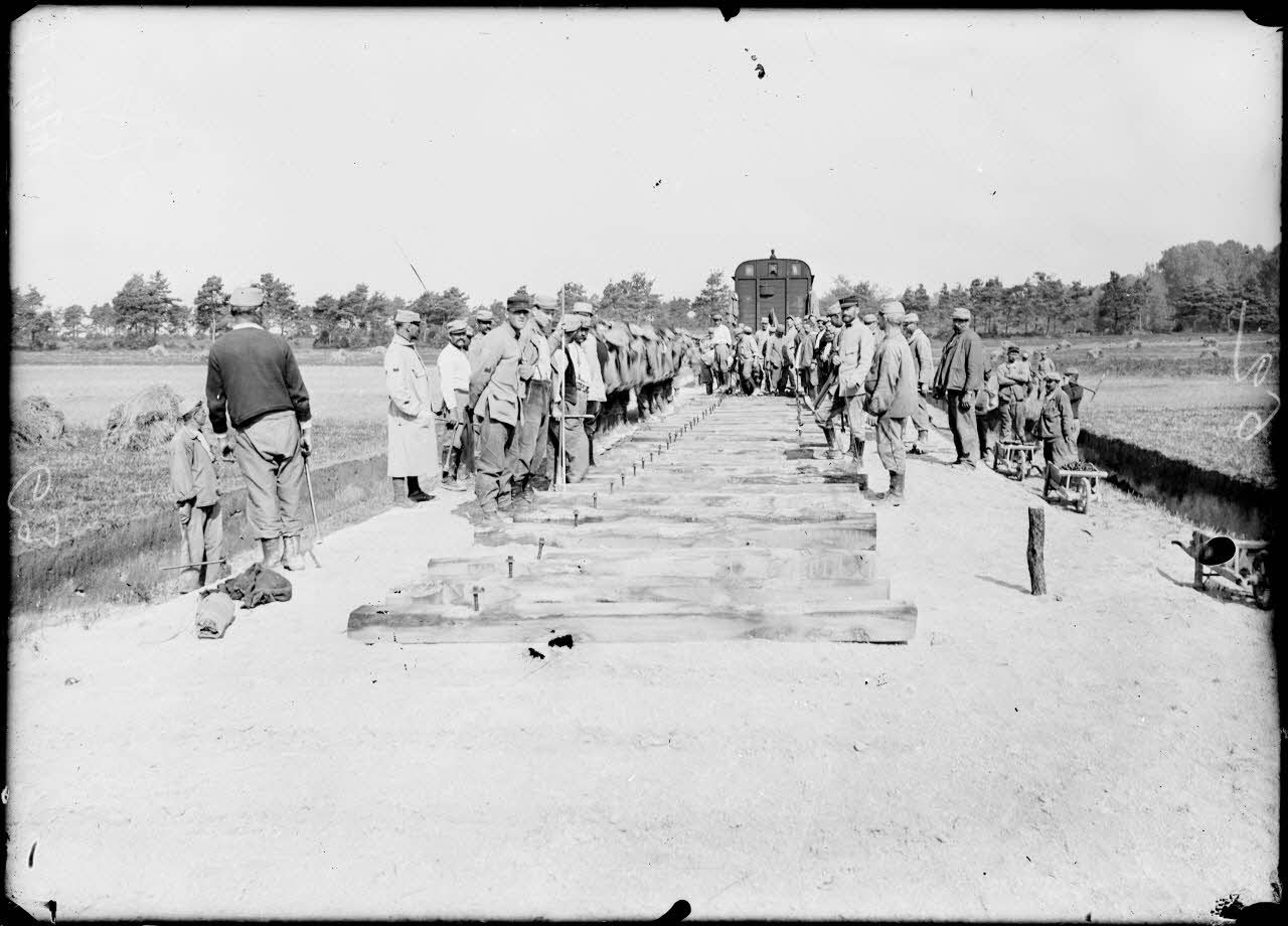 Près de Châlons-sur-Marne. Construction d'une voie ferrée du camp de Mailly à Saint-Hilaire-le-Grand. Pose des rails.
