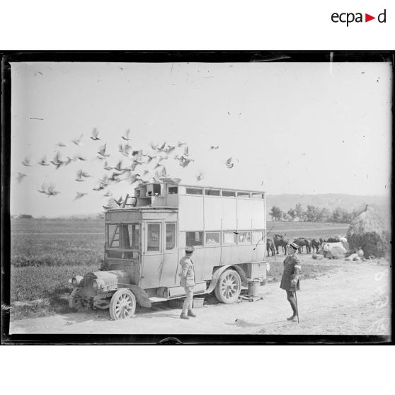 - Á Crugny, (Marne, le 27/05/1917, G 648, G 649, et G 657) une unité colombophile équipée de bus Berliet assure la transmission des messages. Le commandant Marceley, chef de la sûreté au sein de la Xe armée pose dans son bureau. ( (G 665 à G 670) Des soldats d'un régiment d'infanterie sont en période de repos. Certains prennent leur repas, pêchent à la ligne, où circulent en compagnie de leur chien. (De g 679 à G 684) Des soldats se reposent, font leur lessive et se lavent dans des douches aménagées au bord d'une rivière.