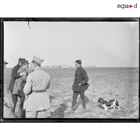 - Sur le terrain d'aviation de la Ferme de la Bonne Maison (Marne, 27/05/1917, G 652 à G 654), l'adjudant Vitalis et le capitaine Duval (chef de la section de photographie aérienne) de l'escadrille SPA 73 du groupe de combat 12 dit "Groupe des Cigognes" posent devant un appareil SPAD XI biplace. (G 685) L'aviateur Soulier (de l'escadrille SPA 3) pose devant des moteurs d'avions allemands abattus.