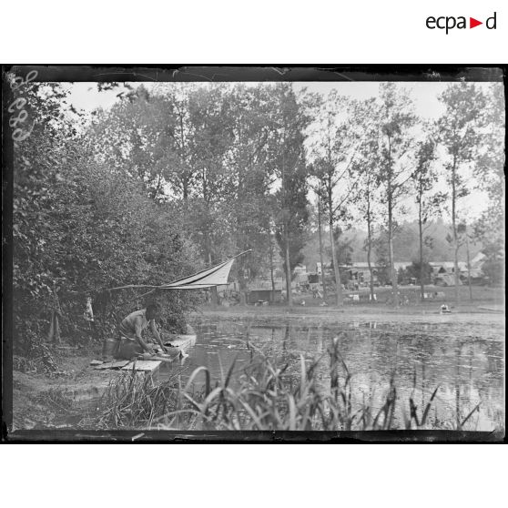 - Á Roucy (Aisne, le 09/06/1917, de G 687 à G 691) les soldats d'un régiment d'infanterie se reposent dans leur cantonnement installé près d'un étang. Le lieutenant Nêtre a été enterré près de là. Des soldat font leur lessive et dorment au bord de l'eau. La cuisine de campagne prépare le repas.