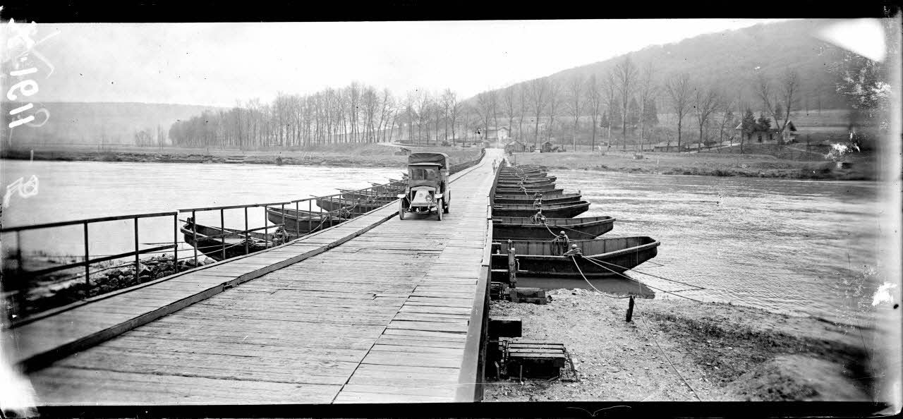 Près de Custines (Meurthe-et-Moselle). Pont de bâteaux sur la Moselle. [légende d'origine]