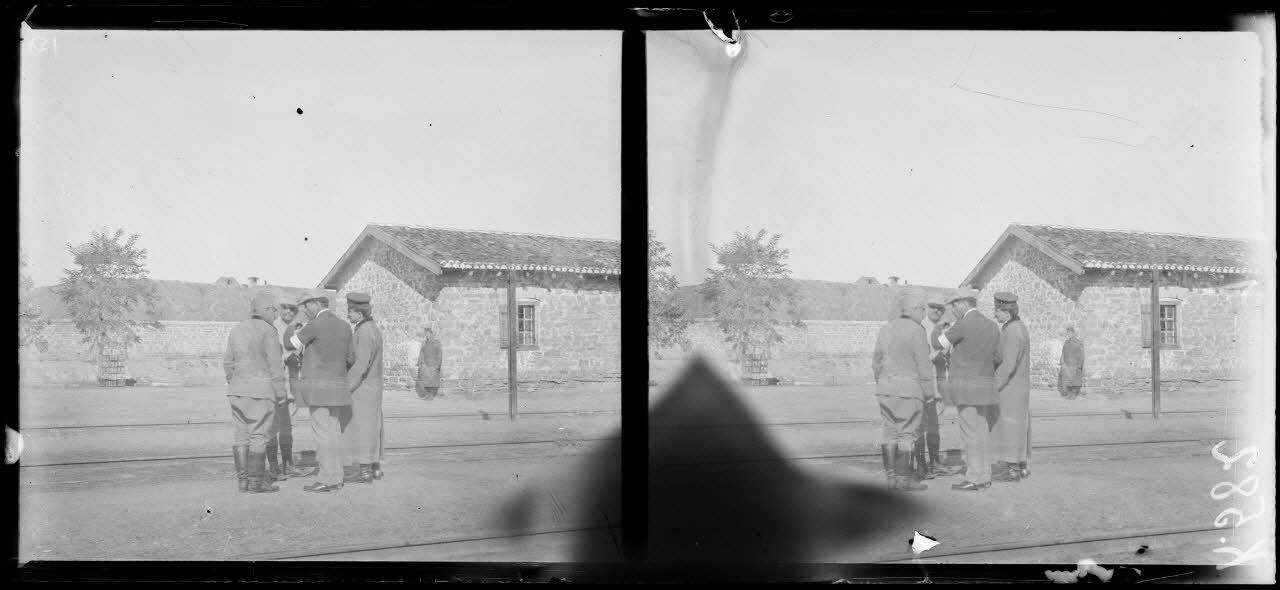 Krivolak. La gare pendant le bombardement. Le général Sarrail, un général de brigade, un officier serbe et un interprète.