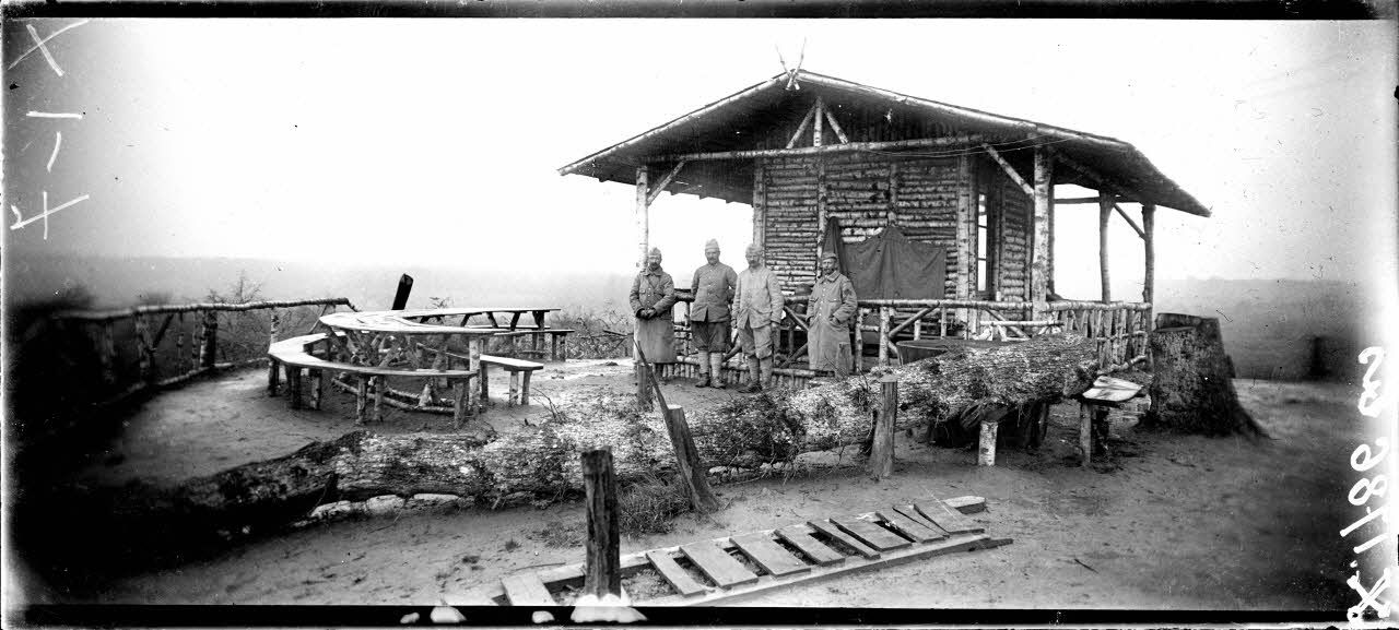 A Jussy (Aisne), membres de la mission italienne devant une cagna.