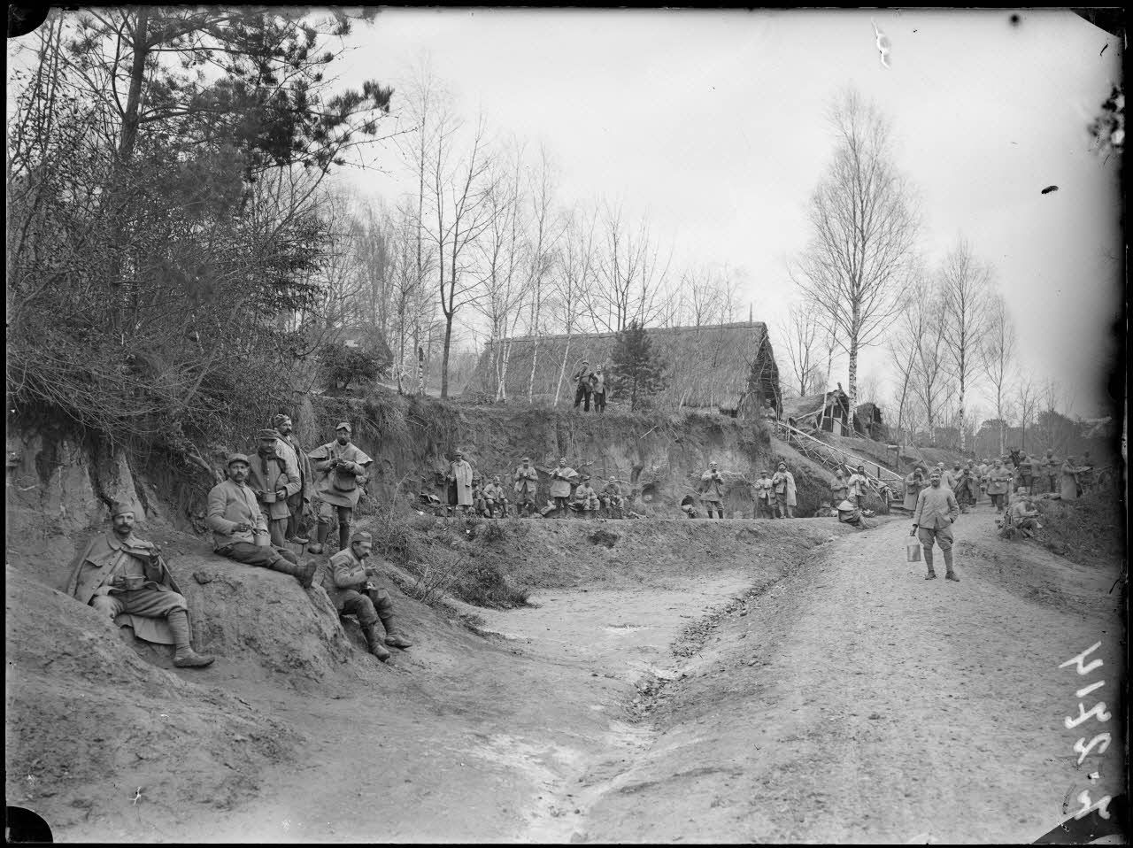 Près de la ferme du Goulot (environs de Jonchery-sur-Marne, Marne). Vue d’ensemble du cantonnement. Au 1er plan les territoriaux mangeant la soupe. [légende d’origine]