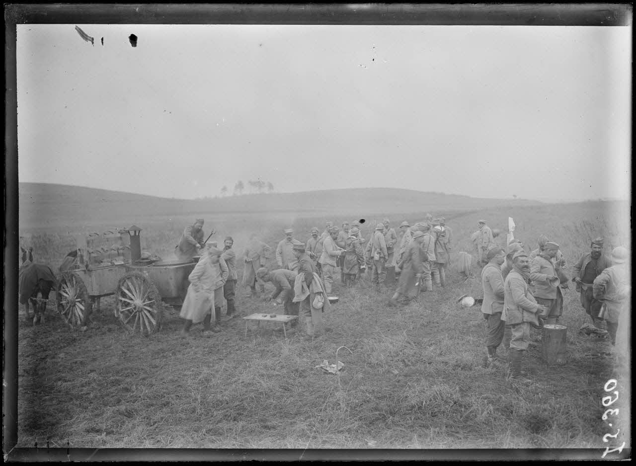 Près de la gare de Muizon, Marne, pose de voie ferrée sur la ligne de Reims. Les travailleurs à la soupe.